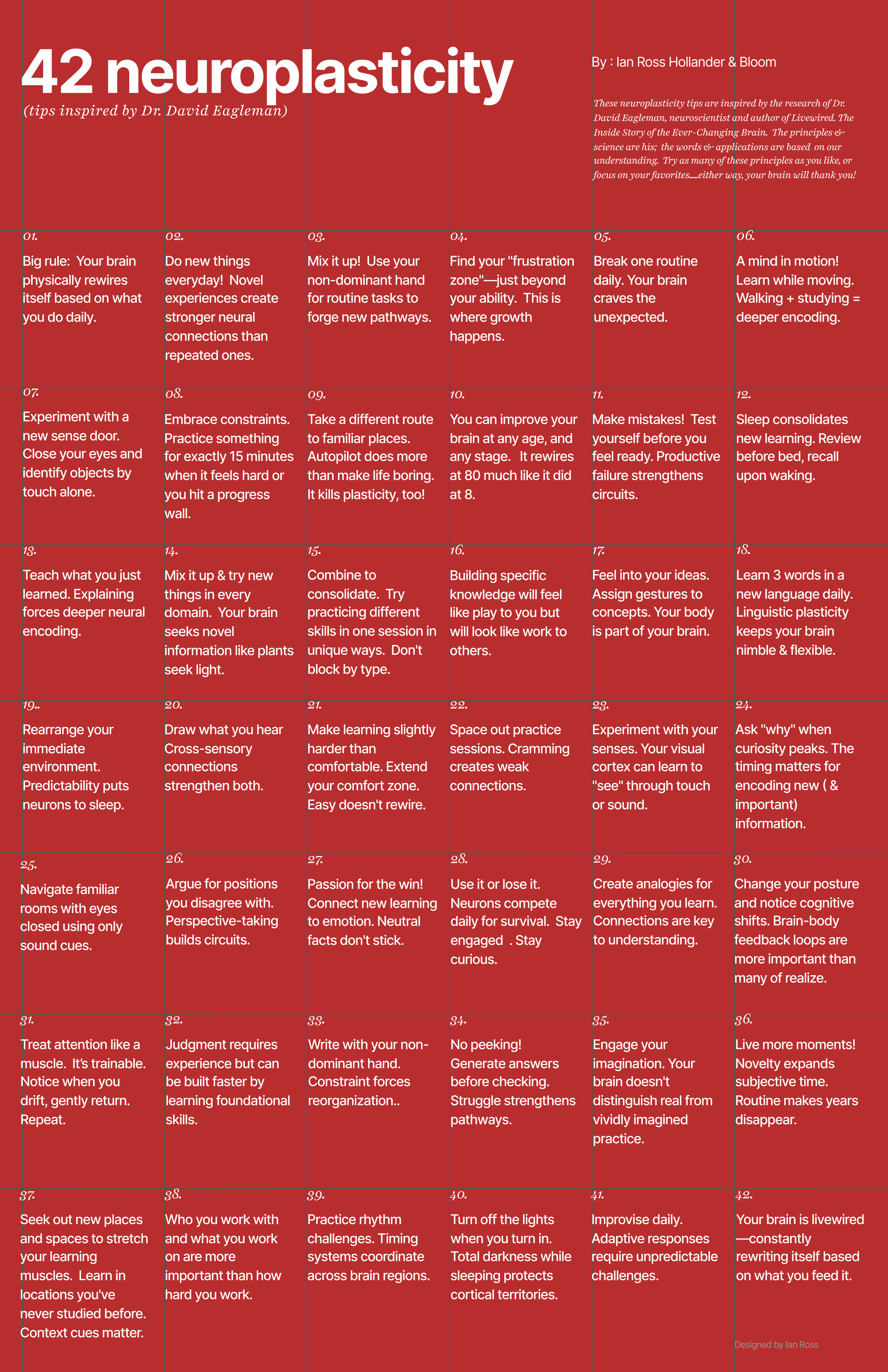 Back 42 neuroplasticity tips inspired by Dr. David Eagleman Ian Ross Hollander March 14, 2026 (1 minute read) Pin this article tiny principles for a better brain at any age....and any stage. A printable poster Inspired by the books and work of David Eagleman posters Inner Space Collection BLOOM! Curated. Tiny visuals. big ideas. Note - for a printable PDF version of this poster, visit our Gumroad store, here!Tiny.Tiny products. Big ideas. #bettertogether Share this article Copied to clipboard Member discussion