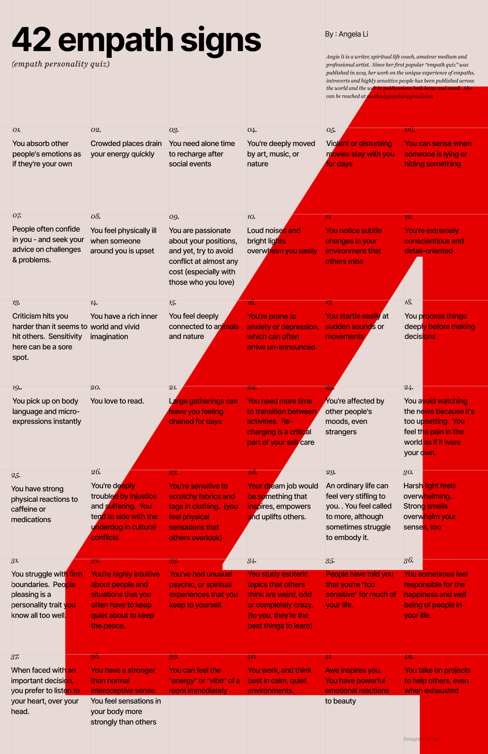 Back 42 Signs You're an Empath Angie Li April 9, 2026 (1 minute read) Pin this article printable poster/wall art for highly sensitive people BLOOM! Curated. Tiny visuals. big ideas. 42 signs you're an empath Share this article Copied to clipboard Member discussion