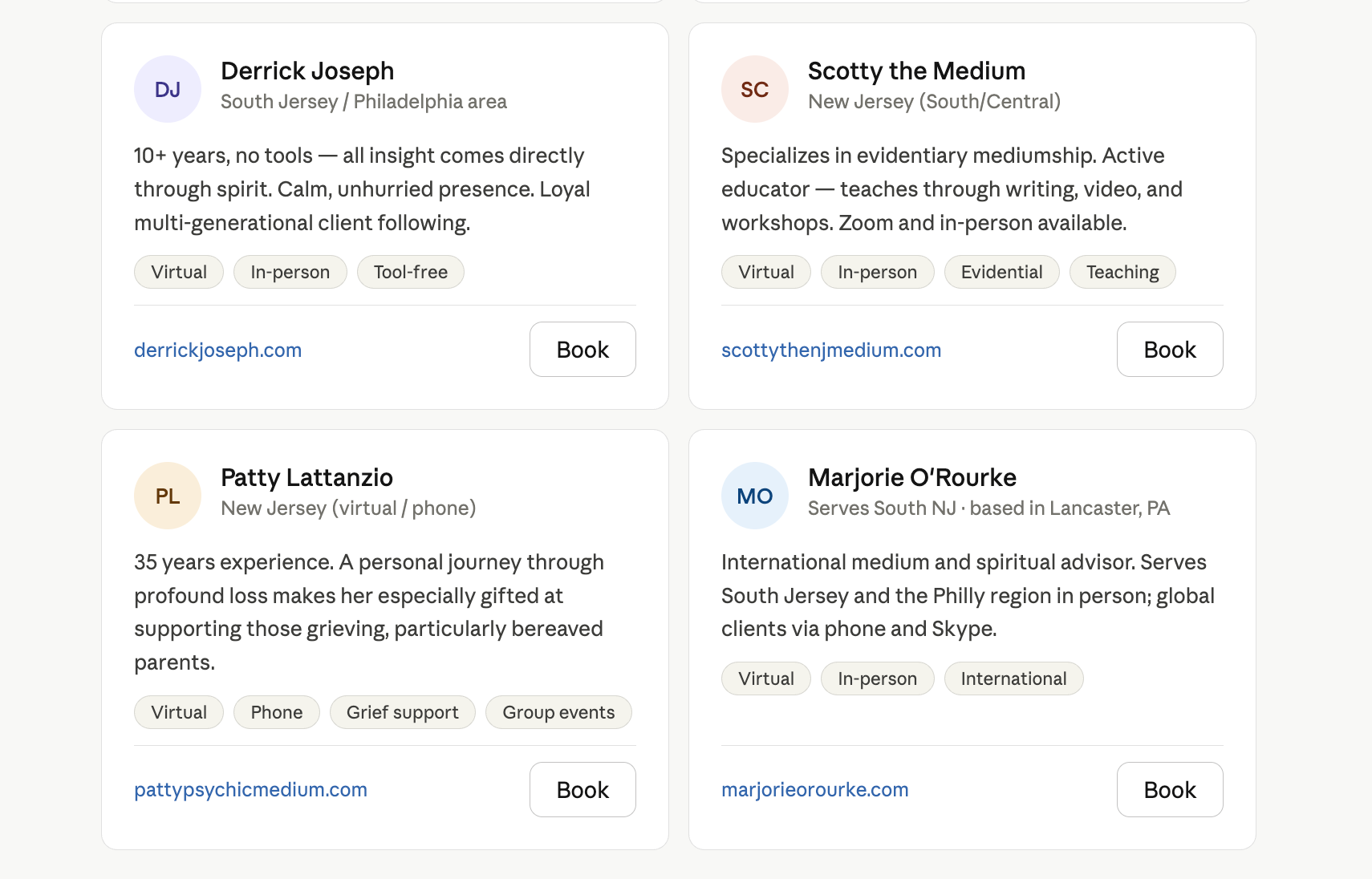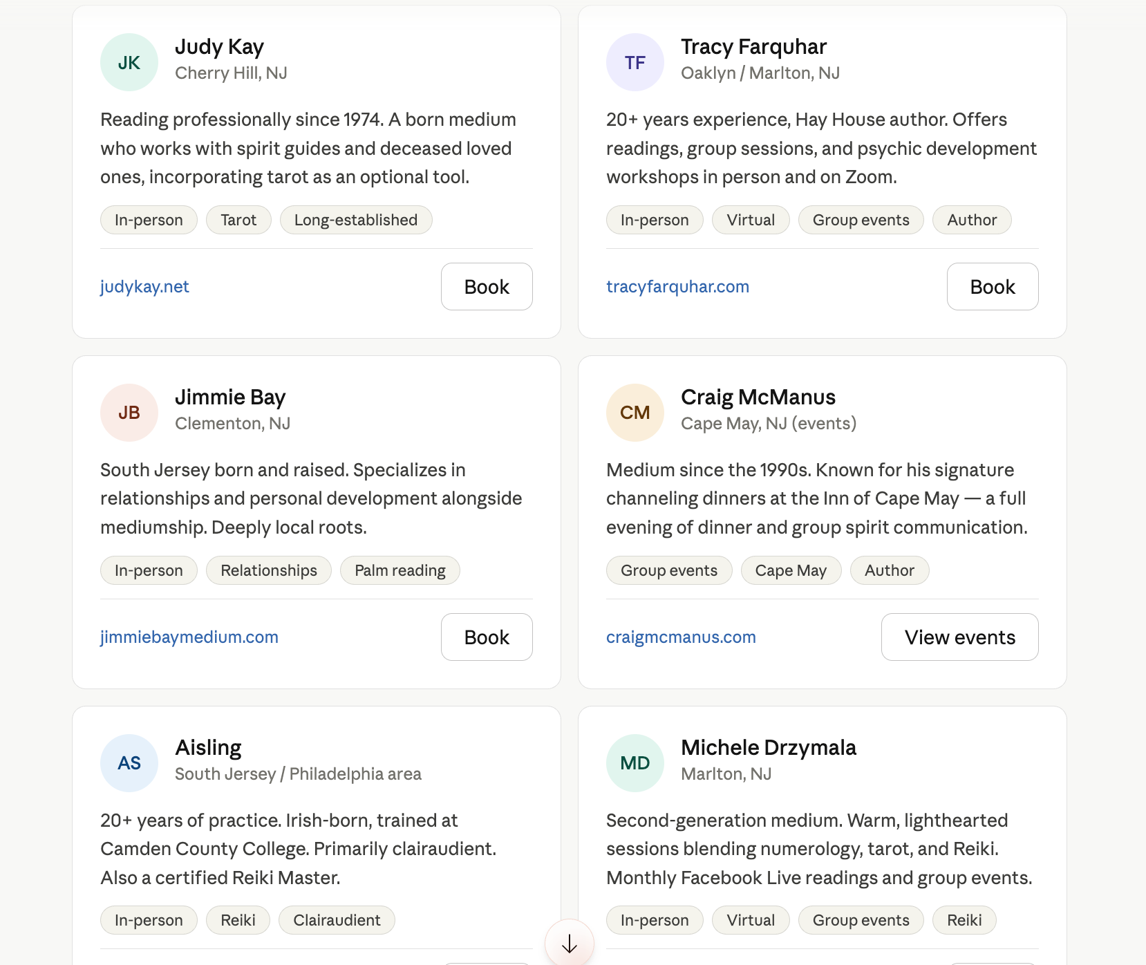 a growing list of highly rated, community recommended psychic mediums in South Jersey. Want to recommend a medium? Reach out via email ([email protected]) to share!